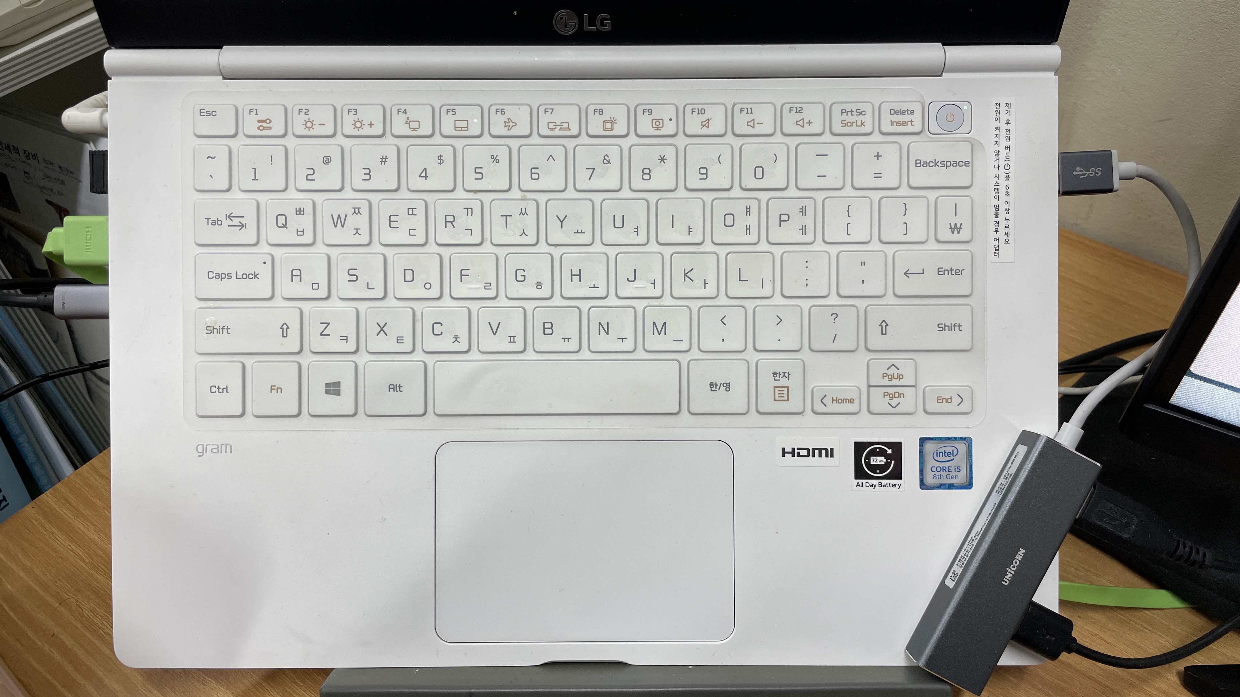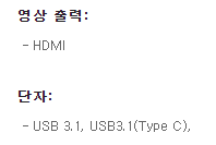 사용 중인 LG 그램 노트북은 영상 출력 단자 HDMI 1개와 단자 USB 3.1 2개, USB-C 3.1 1개가 있는 모델입니다.
