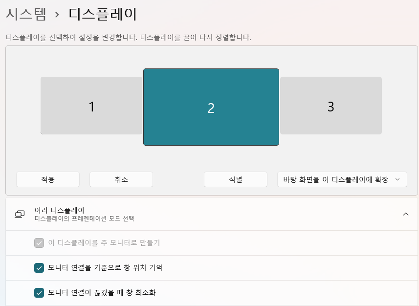 모니터를 추가하게 되면 디스플레이 환경이 바뀔 수 있습니다. 디스플에이 환경 설정은 사용자에 맞게 설정하시면 됩니다.
