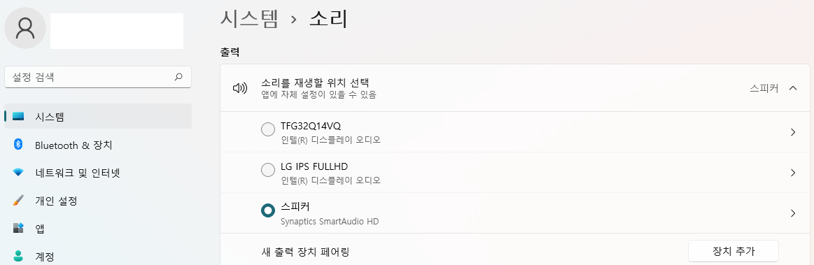 시스템 > 소리 부분을 보시면 출력되는 스피커가 3개임을 볼 수 있습니다. 위 2개는 모니터 장치이고, 맨 아래 스피커가 노트북입니다. 노트북으로 선택하시면 정상적으로 사운드가 나올 거예요.